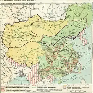К 1636 году его сын Айсиньгьоро Абахай начал вытеснять китайские силы (в поздних переизданиях первоисточников называемых минскими)[2] из Ляонина и провозгласил новую империю Цин. В 1644 году крестьянская повстанческая армия, возглавляемая Ли Цзычэном, захватила столицу империи Мин Пекин. Китайский генерал У Саньгуй вступил в сговор с маньчжурами и открыл Шаньхайгуаньский проход восьмизнамённой армии под командованием принца Доргоня, который нанёс повстанцам поражение и выбил их из Пекина. Маньчжурское завоевание Китая продолжалось до 1683 года и закончилось только во времена императора Канси (правил в 1661—1722). Десять великих походов императора Цяньлуна, которые он организовал в 1750—1790-е, расширили зону влияния Китая в Центральной Азии. Хотя ранние правители империи Цин продолжали придерживаться маньчжурского образа жизни и, нося официальный титул императора, продолжали оставаться одновременно ханами монголов и оказывать покровительство буддизму в Тибете, они правили страной, используя конфуцианский подход и бюрократический аппарат, традиционный для Китая. Они сохранили и использовали традиционную систему экзаменов, чтобы рекрутировать китайцев-хань в государственный аппарат, и прониклись идеалами вассальных отношений с близлежащими странами, привычных со времён прежней империи. В таких регионах, как Тайвань, внешняя политика цинских владык была похожа на колониальную[3].