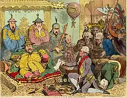 В 1793 году первая из них при поддержке британского правительства отправила в Китай делегацию под руководством лорда Джорджа Макартни, стремясь установить режим свободной торговли и равноправные отношения с китайской стороной. Императорский двор не придавал торговым вопросам большого значения, в то время как англичане считали их жизненно важными для собственной экономики. Император Цяньлун сказал Макартни «правители многонаселённых стран привозят по земле и по морю всевозможные ценные вещи» и «следовательно, мы не испытываем ни в чём недостатка…»[83]