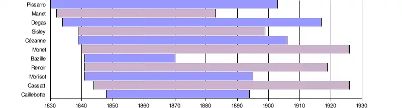 В целом, в стиле импрессионизма работало множество мастеров, но основой движения были Эдуард Мане, Клод Моне, Огюст Ренуар, Эдгар Дега, Альфред Сислей, Камиль Писсарро, Фредерик Базиль и Берта Моризо. Однако Мане всегда называл себя «независимым художником» и никогда не участвовал в выставках, а Дега хоть и участвовал, но никогда не писал свои работы на пленэре.