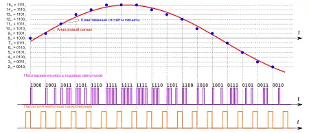Мгновенное измеренное значение (отcчёт) аналогового сигнала квантуется по уровням (округляется от ближайшего целого). Число уровней квантования, обычно, равно или кратно целой степени числа 2, например, 23 = 8, 24 = 16, 25 = 32 и т. д. Номер уровня кодируется двоичными словами длиной 3, 4, 5 и т. д. бит[2].
