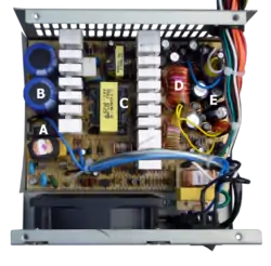 Ниже E — дроссель и конденсатор входного фильтра на сетевом разъёме.