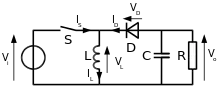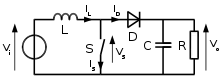 Названия в англоязычной литературе — boost converter (step-up converter). Если ключ S замкнут, то диод D закрыт, и через дроссель L течёт линейно нарастающий ток от источника. Когда ключ размыкается, ток дросселя, который не может измениться мгновенно, начинает протекать через диод D и конденсатор C (заряжая его). К началу следующего цикла практически линейно спадающий ток через конденсатор может уменьшиться до нуля, однако приложенное к нагрузке R напряжение конденсатора почти постоянно — амплитуда пульсаций тем меньше, чем больше ёмкость конденсатора. В отличие от предыдущей схемы, здесь дроссель не является элементом фильтра. Напряжение на нагрузке всегда больше напряжения источника[10][18].