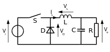 Названия в англоязычной литературе — buck converter (step-down converter). Если ключ S замкнут, то диод D закрыт, и через дроссель L течёт нарастающий ток от источника. Когда ключ размыкается, ток дросселя, который не может измениться мгновенно, начинает протекать через диод D, при этом величина тока уменьшается. При достаточной индуктивности ток дросселя не успевает уменьшиться до нуля к началу следующего цикла (режим неразрывных токов) и имеет пульсирующий характер. Поэтому даже при отсутствии конденсатора C напряжение на нагрузке R будет иметь такой же характер с пульсациями, размах которых тем меньше, чем больше индуктивность дросселя. Однако, на практике увеличение индуктивности связано с увеличением габаритов, массы и стоимости дросселя и потерь мощности в нём, поэтому использование конденсатора для уменьшения пульсаций более эффективно. Сочетание элементов L и C в этой схеме часто называют фильтром[10][17].