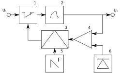 Как и в предыдущей схеме, в процессе работы накопитель энергии (2) или подключён к входному напряжению, или передаёт накопленную энергию в нагрузку. В результате на выходе имеется некоторое среднее значение напряжения, которое зависит от входного напряжения и скважности[11] импульсов управления ключом (1). Вычитатель-усилитель на операционном усилителе (4) сравнивает выходное напряжение с опорным напряжением (6) и усиливает разность, которая поступает на модулятор (3). Если выходное напряжение меньше опорного, то модулятор увеличивает отношение времени открытого состояния ключа к периоду тактового генератора (5). При изменении входного напряжения или тока нагрузки скважность импульсов управления ключом изменяется таким образом, чтобы обеспечить минимальную разность между выходным и опорным напряжением.