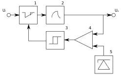 Стабилизатор напряжения с триггером Шмитта называется также релейным или стабилизатором с двухпозиционным регулированием[9]. В нём выходное напряжение сравнивается с нижним и верхним порогами срабатывания триггера Шмитта (4 и 3) посредством компаратора (4), который обычно является входной частью триггера Шмитта. При замкнутом ключе (1) входное напряжение поступает на накопитель энергии (2), выходное напряжение нарастает, и после достижения верхнего порога срабатывания Umax триггер Шмитта переключается в состояние, размыкающее ключ (1). Накопленная энергия расходуется в нагрузке, при этом напряжение на выходе стабилизатора спадает, и после достижения нижнего порога срабатывания Umin триггер Шмитта переключается в состояние, замыкающее ключ. Далее описанный процесс периодически повторяется. В результате на выходе образуется пульсирующее напряжение, размах пульсаций которого зависит от разности порогов срабатывания триггера Шмитта.