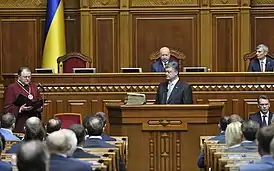 Инаугурация Петра Порошенко — инаугурация пятого президента Украины Петра Порошенко, которая состоялась 7 июня 2014 года. Торжественное заседание Верховной Рады Украины было запланировано на десять часов; в 11 часов состоялась церемония представления командующих видов Вооруженных сил Украины и торжественного поднятия флага президента Украины на Софийской площади[1]. Прямую трансляцию инаугурации президента вживую транслировали телеканалы «Первый национальный», «Рада», 1+1, 5 канал и «Интер»; было объявлено, что телетрансляция будет вестись на украинском, русском, английском, немецком, французском и испанском языках[2]. Президентскую присягу проводил Председатель Конституционного Суда Украины Юрий Баулин.