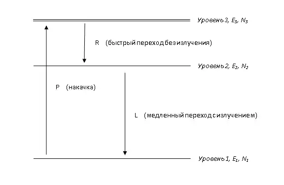 =================================== уровень 4, E4, N4 ^ | | | Ra (быстрый переход без излучения) | V --|-------------------------------- уровень 3, E3, N3 | | | | | P | | (накачка) | L (медленный переход с излучением) | | | | | V --|-------------------------------- уровень 2, E2, N2 | | | | Rb (быстрый переход без излучения) | V ----------------------------------- уровень 1 (осн. состояние), E1, N1
