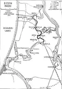В 1920 году по условиям Тартуского мирного договора между РСФСР и Эстонией небольшая часть Западной Ингерманландии, так называемая Эстонская Ингерманландия (фин. Viron Inkeri), расположенная вдоль правого берега реки Нарвы, была включена в состав Эстонской республики[118][17]. Новая граница прошла между реками Лугой и Нарвой[16]. Образованная на присоединённой к Эстонии территории волость Нарва включала в себя Ивангород, реку Россонь и 13 деревень, где проживали около 1800 человек[119][120][17].