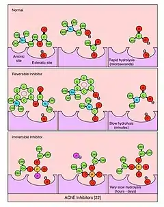 Ингибиторы ацетилхолинэстеразы классифицируются как обратимые, необратимые или квазинеобратимые (также называемые псевдонеобратимые).[3][4]
