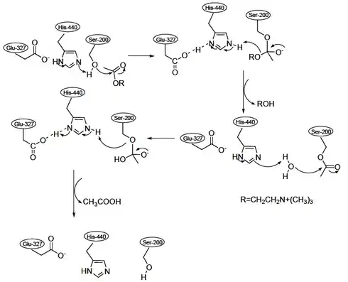 В эстеразном участке ацетилхолин расщепляется, что приводит к образованию свободной холиновой части и ацетилированной холинэстеразы. Это ацетилированное состояние требует гидролиза для собственной регенерации.[3][5] Ингибиторы, подобные ТЭПФ, изменяют остаток серина в эстеразном участке холинэстеразы.