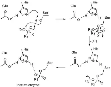 Органофосфаты, такие как ТЭПФ и зарин, ингибируют холинэстеразы, ферменты, которые гидролизуют нейромедиатор ацетилхолин. Активный центр холинэстераз имеет два важных участка, а именно анионный участок и эстеразный участок. После связывания ацетилхолина с анионным участком холинэстеразы ацетильная группа ацетилхолина может связываться с эстеразным участком. Важными аминокислотными остатками в эстеразном участке являются глутамат, гистидин и серин. Эти остатки опосредуют гидролиз ацетилхолина.