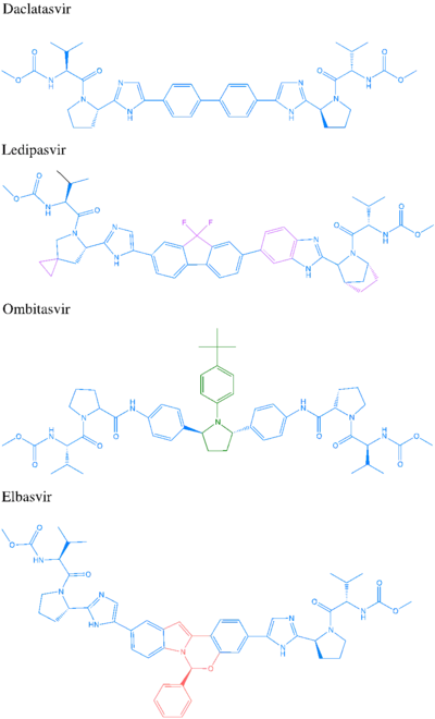 Первый ингибитор белка NS5A, который получил одобрение FDA в 2015 году, был даклатасвир[13]. Другие препараты были одобрены, среди них, в частности, ледипасвир, который, наряду с софосбувиром, входят в состав препарата Harvoni[14][15].
