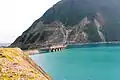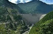 - Арочная бетонная плотина высотой 271,5 м и длиной по гребню 728 м на реке Ингури. Является второй по высоте (после каменно-набросной плотины Нурекской ГЭС) плотиной на территории бывшего СССР и 6-й по высоте плотиной мира. Плотина состоит из пробки высотой 50 м и собственно арочной плотины высотой 221,5 м (спад 510,5/289,0). Толщина плотины на уровне верха пробки — 52 м, на отметке гребня — 10 м. В теле плотины расположено семь водосбросных отверстий диаметром 5 м, используемых для холостого сброса воды; кроме того, на гребне плотины имеется 12 полупролётов шириной по 3,5 м и глубиной 9,6 м, рассчитанных на пропуск до 2700 м³/с воды.