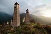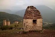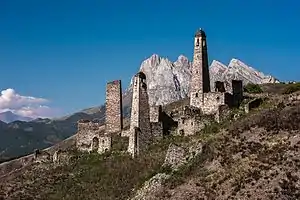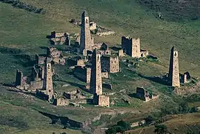 В период раннего Средневековья история ингушей тесным образом связана с северокавказскими аланами и Аланским государством (конец IX — начало XIII вв.)[62], в состав которого они входили (наряду с предками осетин, карачаевцев, балкарцев и чеченцев)[63][64]. По версии ингушских исследователей столица Алании — город Магас находился на территории Ингушетии в районе, охватывающим часть современных городов Магаса, Назрани и селений Яндаре, Гази-Юрт, Экажево, Али-Юрт и Сурхахи, то есть в местности, где расположены многочисленные памятники аланского времени. На обозначенной территории имеется целый ряд аланских городищ. Исследователями отмечено, что многие городища здесь расположены группами или «гнёздами» в пределах видимости. В некоторых из этих групп выделяется, как правило, своими большими размерами, укреплённостью и сложностью планировки одно из центральных городищ, к которому тяготеют менее значительные. «Гнездовое» расположение городищ связывается с сильными родоплеменными пережитками в соответствующем обществе[65]. По мнению В. Б. Виноградова, данный район группы памятников — один из крупнейших на Северном Кавказе[66][67].