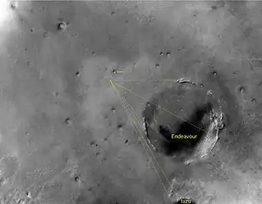7 марта 2009 года (1820 сол) «Оппортьюнити» впервые увидел край кратера Индевор, отъехав при этом на 3,2 километра от кратера Виктория, который он покинул в августе 2008 года[6][14]. Также он увидел кратер Iazu с диаметром около 7 километров, который находился в 38 километрах от него[14]. В это время «Оппортьюнити» был в 12 километрах от кратера Индевор, но для того, чтобы избежать опасных мест, было решено двигаться не напрямик, а по другому пути, длина которого на 30 % больше[6]. Подсчитали, что на его преодоление роверу понадобится более одного марсианского года (23 месяца)[6]. 5 мая 2010 года путь удлинили до 19 км, чтобы избежать опасных дюн между кратером Виктория и кратером Индевор[15].