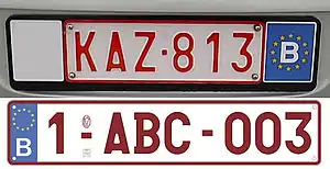 Передний номерной знак может быть идентичен заднему или похож на европейский номерной знак с изображением голубого флага ЕС. Задний номерной знак крепится поверх другой таблички, на которой изображена буква «В» и обычно логотип производителя автомобиля.