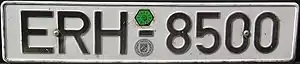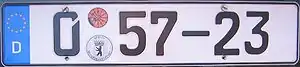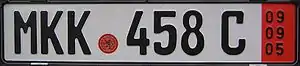![]() | Незарегистрированные ТС имеют краткосрочные номерные знаки, действительные 5 дней. Цифровой код начинается с цифры 04, например, DD-0400. Сам же номерной знак имеет с правой стороны жёлтую полосу, на которую нанесена дата, месяц и год, до которого действительны данные номера. ТС с такими номерными знаками не должны проходить технический осмотр, но должны быть технически исправны. Большинство страховых компаний учитывает данный взнос, если позднее автомобиль регистрируется и проходит страхование в той же страховой компании. |