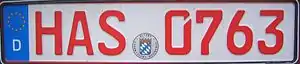 ![]() | Данные красные регистрационные знаки (Wechselkennzeichen) используются дилерами для временной регистрации автомашин (для транспортировки). Они не закреплены за определённой машиной, а выдаются дилеру. Данный пример (без синего поля слева) устарел. |