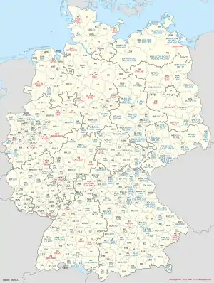 Далее на номерном знаке указывается от одной до трёх букв, указывающие, в каком городе или районе федеральной земли зарегистрирован автомобиль. Количество букв в префиксе города/района федеральной земли зависит от размера и расположения. Самые крупные города Германии обычно имеют однобуквенный префикс (B — Берлин, M — Мюнхен, K — Кёльн, F — Франкфурт-на-Майне), большинство же остальных городов и районов страны имеют двух- и трёхбуквенные префиксы. Кодовые обозначения городов и районов восточной Германии имеют больше букв. Это связано с двумя причинами: