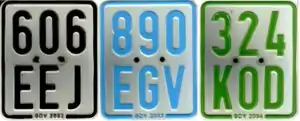 ![]() ![]() ![]() | Автомобили официальных служб, как, например, полицейские автомобили, автомобили пожарных и муниципальных служб, на номерных знаках не имеют букв, расположенных после стикеров. Нумерация следующая[4]:
