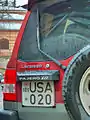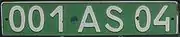 - Транзитные номерные знаки (экспорт). Выполняются чёрными символами на белом фоне, слева помещаются четыре цифры, справа — две буквы. Между буквами и цифрами помещается красная полоса с расположенными друг под другом прямоугольными белыми окошками, в верхнем окошке пишется год действия номера, в нижнем — месяц (фактически же нижнее окно чаще всего остаётся пустым). Данные номера имеют уменьшенный размер и выполняются в виде наклейки.