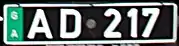 - Военные номерные знаки. Выполняются белыми символами на чёрном фоне, формат — две буквы и три цифры. Слева номерного знака помещается узкая зелёная полоска, на которой друг под другом написаны буквы G и A.