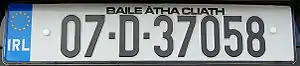 С 1991 года, дизайн ирландских номерных знаков базируется на стандарте Европейских номерных знаков. В соответствии с этим стандартом, на знаке с левой стороны изображается синяя полоса с 12 звездами Европейского союза и обозначение страны IRL (Ирландия). Номерные знаки имеют черные символы на белом фоне. В отличие от большинства европейских государств, в Ирландии нет специальных норм, относительно шрифта на номерном знаке, отмечается только что размер букв должен быть разборчивым, но не более 70 мм в высоту и 36 мм в ширину, на белом светоотражающем фоне. В отличие от свободных требований, относительно шрифта, размер пробела между буквами должен быть минимум — 13 мм x 10 мм, максимум — 22 мм x 10 мм. Также допускается использование полных ирландских названий округов, которые записываются над их кратким обозначением.