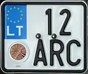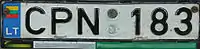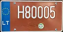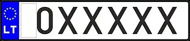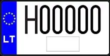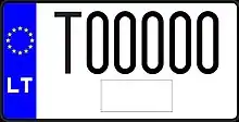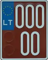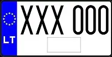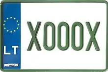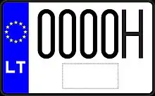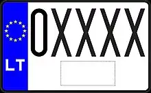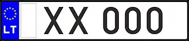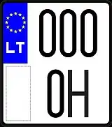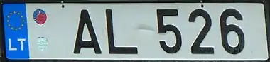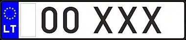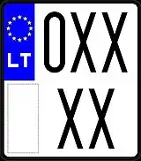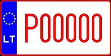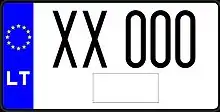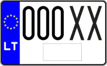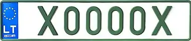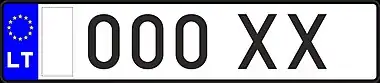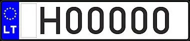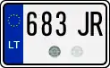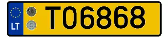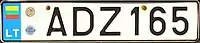Знаки имеют квадратное двухрядное исполнение, формат: две цифры в верхнем ряду, три буквы в нижнем. Синяя полоса с флагом ЕС и кодом «LT» доходит только до середины знака, на вторую половину клеился стикер. Выдаются с 2007 года.