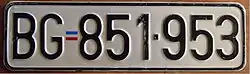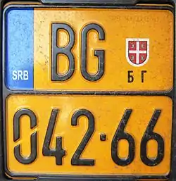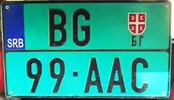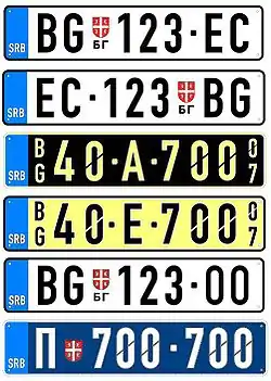 Автомобильные номера в Сербии состоят из двух букв кода региона, трех цифр и двух букв, разделенных дефисом (например, BG 123-AA). Код региона и трехзначная цифра разделяются Гербом Сербии. Синие поля располагаются в левой части, как и в странах ЕС, имея международный код страны SRB.