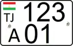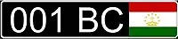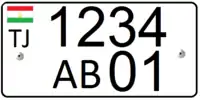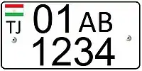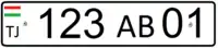 Выполняются чёрными символами на белом фоне; знак — квадратный двухрядный. В верхнем ряду наносится государственный флаг республики Таджикистан, под которым написан автомобильный код «TJ», далее следуют три цифры; в нижнем ряду располагаются буква и две цифры региона регистрации.