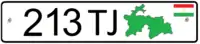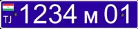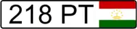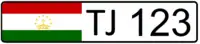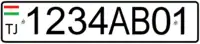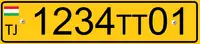 Выполняются чёрными символами на белом фоне. Формат — три цифры и буквосочетание «РТ», вместо окна с кодом региона — крупный флаг республики Таджикистан.