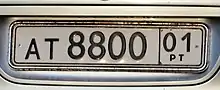 Практически идентичны соответствующему российскому стандарту, только в окне с номером региона присутствует сочетание «РТ». Существует и вторая разновидность номерного знака, где нижняя строчка имеет вид «ББЦЦРТ» (Б — буква, ЦЦ — код региона, РТ — сочетание «РТ»).