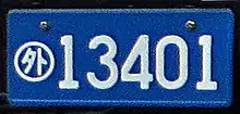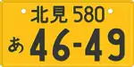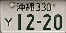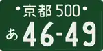 Таким образом, автомобильный номер в Японии имеет следующий формат: «KK?*H##-##» (например, «足立500き21-41»), где «KK» — это название офиса, выдавшего документ, написанное кандзи, «H» — это хирагана, «?» — это «5» для транспортных средств объемом менее 2000 см³ и «3» для транспортных средств объемом более 2000 см³ (другие номера менее распространены: «1» — для больших грузовых автомобилей, «2» — для автобусов и т. д.[1]), «*» — это число от 0 до 99 (на номерных знаках до 1971 года отсутствует), а «#» — это число от 0* до 9 (*вместо ведущих нулей ставятся интерпункты).