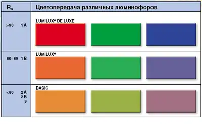 | Характеристика цветопередачи | Степень цветопередачи | Коэффициент цветопередачи | Примеры ламп |