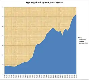 Войны с Китаем в 1962 и Пакистаном в 1965 годах привели к дефициту бюджета, который потребовал опустить курс национальной валюты до 7,57 рупии за доллар. В последующие годы стоимость индийских денег прогрессивно снижалась. В 1975 году 1 доллар стоил 8,39, в 1985 — 12 рупий. В 1991 году государство столкнулось с кризисом платёжного баланса. Золотовалютные резервы упали до минимума. Это отразилось на курсе рупии, который достиг 17,90 за доллар. В 1993 году центральное правительство отказалось от фиксированного курса национальной валюты и перешло на плавающий. Стоимость рупии упала до 31,37 за доллар. Мировой экономический кризис вызвал дальнейшее обесценивание индийских денег, которое в августе 2013 году достигло 68 рупий за доллар. В апреле 2015 года курс рупии составлял 62 за доллар [14][16].