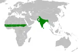 В Африке естественный ареал этой птицы представляет собой полосу, идущую с востока на запад, к северу от зоны влажных лесов, но южнее Сахары. Африканская часть ареала попугая охватывает Мали, южную часть Нигера, северные районы Ганы и Буркина-Фасо, Того, Бенин, юг Нигерии, Камеруна и Чада, север ЦАР, Южный Судан, северную часть Уганды, Эфиопию, Джибути и северо-западную часть Сомали. Азиатская часть ареала — это почти вся Южная Азия (Индия, Пакистан, Бангладеш, Непал, Цейлон) и часть Юго-Восточной Азии (юг Мьянмы)[6][12].