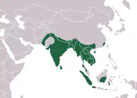 Вид широко распространён в Юго-Восточной Азии. Встречается в самых разнообразных местах обитания, в первичных и вторичных лесах, сельской местности на высоте до 400 м над уровнем моря.