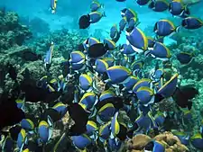 Флора и фауна Индийского океана необычайно разнообразны. Тропическая область выделяется богатством планктона. Особенно обильна одноклеточная водоросль триходесмиум (цианобактерии), из-за которой поверхностный слой воды сильно мутнеет и меняет свою окраску. Планктон Индийского океана отличает большое число светящихся ночью организмов: перидиней, некоторых видов медуз, гребневиков, оболочников. Обильно встречаются ярко окрашенные сифонофоры, в том числе ядовитые физалии. В умеренных и арктических водах главными представителями планктона являются копеподы, эуфаузиды и диатомеи. Наиболее многочисленными рыбами Индийского океана являются корифены, тунцы, нототениевые и разнообразные акулы. Из пресмыкающихся имеются несколько видов гигантских морских черепах, морские змеи, из млекопитающих — китообразные (беззубые и синие киты, кашалоты, дельфины), тюлени, морские слоны. Большинство китообразных обитают в умеренных и приполярных областях, где благодаря интенсивному перемешиванию вод возникают благоприятные условия для развития планктонных организмов[14]. Птицы представлены альбатросами и фрегатами, а также несколькими видами пингвинов, населяющими побережья Южной Африки, Антарктиды и острова, лежащие в умеренном поясе океана[15].