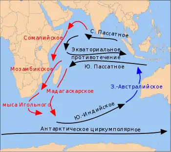 В южном полушарии течения носят постоянный характер, без сезонных колебаний. Возбуждаемое пассатами Южное Пассатное течение пересекает океан с востока на запад к Мадагаскару. Оно усиливается в зимнее (для южного полушария) время, за счёт дополнительного питания водами Тихого океана, поступающих вдоль северного берега Австралии. У Мадагаскара Южное Пассатное течение разветвляется, давая начало Экваториальному противотечению, Мозамбикскому и Мадагаскарскому течениям. Сливаясь юго-западнее Мадагаскара, они образуют тёплое течение Агульяс. Южная часть этого течения уходит в Атлантический океан, а часть вливается в течение Западных ветров. На подходе к Австралии от последнего отходит на север холодное Западно-Австралийское течение. В Аравийском море, Бенгальском и Большом Австралийском заливах и в приантарктических водах действуют местные круговороты[14].