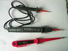 Такие индикаторы представляют собой более сложную конструкцию; вместо шунтового контакта из корпуса выходит отдельный проводник в усиленной изоляции со своим наконечником (щупом). Преимуществом является возможность указания численного значения напряжения помимо наличия фазы, т.к. вместо неоновой лампы имеют подсвечиваемую светодиодами шкалу. Кроме определения фазы, их конструкцией может быть предусмотрена возможность теста УЗО, о чём должно оповещаться в инструкции. Могут индицировать как переменное, так и постоянное напряжение с указанием полярности. Ряд моделей имеет функцию прозвонки цепи, для чего оснащаются источником питания, — обычно двумя батареями типа ААА. Важно отметить, что функция определения напряжения действует и при полностью разряженной батарее. Рабочее напряжение большинства подобных тестеров 690В.