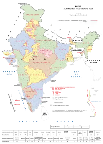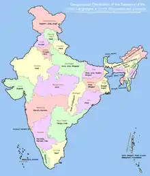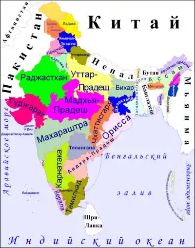 Индия является федеративной республикой, состоящей из 28 штатов и 8 союзных территорий (включая национальный столичный округ Дели)[64]. Все штаты и три союзные территории (национальный столичный округ Дели, Джамму и Кашмир, Пондичерри) имеют собственное избираемое правительство. Остальные пять союзных территорий управляются администратором, назначаемым центральной властью, и следовательно находятся под прямым управлением президента Индии. В 1956 году индийские штаты были реорганизованы согласно языковому признаку[65]. С тех пор, административная структура практически не менялась.
