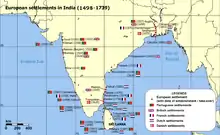 Открытие португальским мореплавателем Васко да Гама нового морского пути из Европы в Индию положило начало прямой индо-европейской торговле[47]. Португальцы основали торговые колонии в Гоа, Дамане, Диу и Бомбее. За ними пришли голландцы, датчане и англичане, создав в 1619 году торговый пост в портовом городе Сурат на западном побережье[48]. Затем пришли и французы. Внутренние конфликты между индийскими царствами позволили европейским торговцам постепенно установить политическое влияние и приобрести земли. Хотя европейские державы и сумели удержать под своим контролем различные индийские регионы на протяжении XVIII века, позднее они были вынуждены уступить почти все эти территории англичанам, за исключением французских форпостов Пондишерри и Чандернагор, голландского портового города Коромандель (до 1825 года), и португальских колоний Гоа, Даман и Диу.
