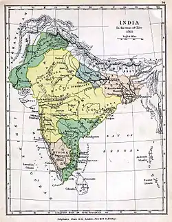 В 1617 году Британская Ост-Индская компания получила право торговать с Индией от Могольского императора Джахангира[49]. Постепенно всё возраставшее влияние Компании подвигло де-юре могольского правителя Фаррукха Сияра в 1717 году даровать ей разрешение на свободную безналоговую торговлю в Бенгалии[50]. Наваб Бенгалии Сирадж-уд-Даула, являвшийся де-факто правителем Бенгалии, воспротивился попыткам англичан воспользоваться этими привилегиями. Это привело к битве при Плесси в 1757 году, в которой «армия» Ост-Индской компании под предводительством Роберта Клайва одержала победу над военными подразделениями наваба. В том же году Клайв был назначен Компанией «губернатором» Бенгалии[51]. После битвы при Буксаре в 1764 году Компания приобрела гражданские права на управление Бенгалией от могольского падишаха Шаха Алама II, что формализовало правление англичан, которое в течение последующего столетия распространилось на всю Индию и положило конец правлению Моголов[52]. Британская Ост-Индская компания монополизировала торговлю в Бенгалии. Англичане ввели особую систему налогов на землю, называемую «постоянное поселение», которая установила неофеодальное общественное устройство. К началу 1850 годов Ост-Индская компания контролировала большую часть индийского субконтинента, включая современные Пакистан и Бангладеш. Англичане в своей колониальной политике следовали принципу «разделяй и властвуй», пользуясь государственной раздробленностью Индии и конфликтами как между различными княжествами, так и между разными социальными и религиозными группами.