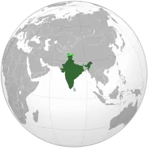 Индия расположена на территории Южной Азии и занимает седьмое место в мире по площади (3 287 590 км², в том числе, суши: 90,44 %, водной поверхности: 9,56 %)[8]. Имеет сухопутные границы с Пакистаном на западе, с Китаем, Непалом и Бутаном на северо-востоке, с Бангладеш и Мьянмой на востоке. Кроме того, Индия имеет морские границы с Мальдивскими островами на юго-западе, со Шри-Ланкой на юге и с Индонезией на юго-востоке[8]. Спорная территория Ладакх имеет границу с Афганистаном[9].