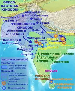 Около 520 года до н. э., во время правления персидского царя Дария I, северо-западная часть индийского субконтинента (современные восточный Афганистан и Пакистан) были завоёваны персидской империей Ахеменидов, оставшись подвластными ей в течение двух последующих столетий[35]. В 334 году до н. э. Александр Македонский, завоевав Малую Азию и империю Ахеменидов, достиг северо-западных границ индийского субконтинента. Там он одержал победу над царём Пором в Битве на Гидаспе и завоевал большую часть Пенджаба[36]. Тем не менее войска Александра отказались следовать на ту сторону реки Биас к месту, где в настоящее время расположен город Джаландхар. Оставив многих македонских солдат-ветеранов в завоёванных регионах, Александр ушёл со своей армией на юго-запад.