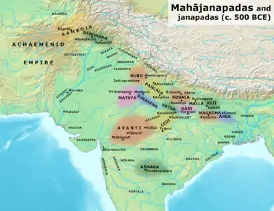 К V веку до н. э. образовалось 16 царств или «республик», известных как Махаджанапады — Каши, Кошала, Анга, Магадха, Вриджи, Малла, Чеди, Ватса, Куру, Панчала, Матсья, Шурасена, Ассака, Аванти, Гандхара и Камбоджи. Они раскинулись по Индо-Гангской равнине от современного Афганистана до Махараштры и Бенгалии. В это время начался второй крупный период урбанизации после Индской цивилизации. На остальной части субконтинента, по всей видимости, существовало множество других маленьких государственных образований, о которых известно по упоминаниям в литературе. В одних из них царская власть передавалась по наследству, а в других подданные сами выбирали своих правителей. Основным языком образованных людей в то время являлся санскрит, а простое население Северной Индии общалось на различных местных диалектах, так называемом пракрите. К V веку до н. э., то есть ко времени рождения Будды, многие из 16 царств объединились и образовали четыре более крупных государства. Это были Ватса, Аванти, Кошала и Магадха[33].