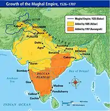 В 1526 году потомок Тимура Бабур, принадлежавший к династии Тимуридов, перешёл через Хайберский перевал и основал Империю Великих Моголов, которая просуществовала более 200 лет[45]. К началу XVII века под контролем династии Моголов оказалась большая часть индийского субконтинента.