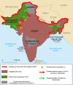 Территории Британской Индии получили независимость в 1947 году, после чего Индия была разделена на Индийский Союз и Пакистанский доминион. По причине разделения Пенджаба и Бенгалии начались кровавые столкновения между индусами, сикхами и мусульманами, в результате которых погибло более 500 000 человек[58]. Разделение Индии также привело к одной из самых больших миграций населения в современной истории мира — около 12 миллионов индусов, сикхов и мусульман расселились по территории недавно созданных государств Индии и Пакистана[58].