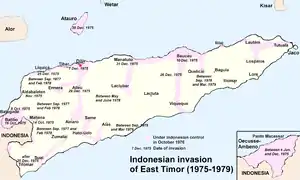 Индонезийские военные под предлогом обращений к ним восточнотиморских лидеров ввели 7 декабря 1975 года в Восточный Тимор войска и оккупировали его, подавив вооружённое сопротивление к 1979 году. После создания спорного временного правительства в лице Народного собрания, по мнению многих, не являвшегося подлинным проявлением права на самоопределения, Индонезия объявила Восточный Тимор своей 27-й провинцией .