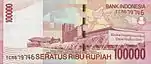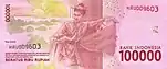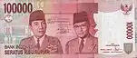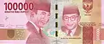 100 000 | 151×65 | красный | портрет Сукарно и Мохаммада Хатты | здание Совета народных представителей (парламента) | с 2004 |